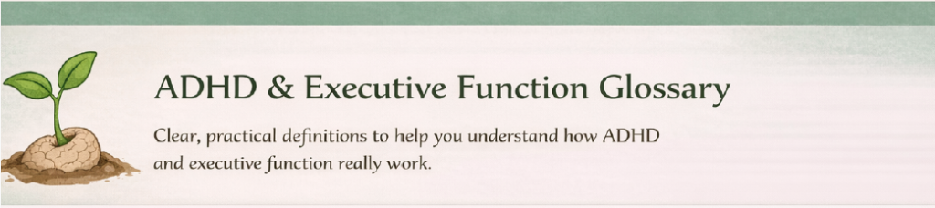 Clear, modern glossary focused on adult ADHD presentations.